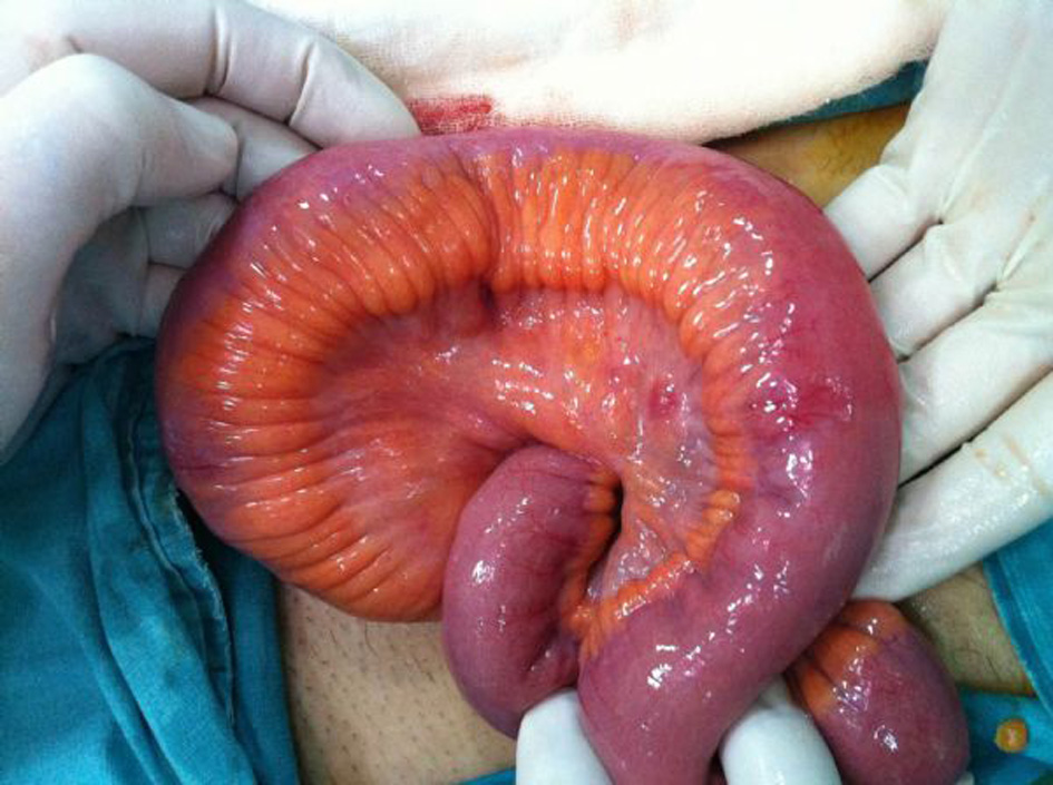 A 25-year-old male patient consulted us because of abdominal pain for 2 days. Physical examination showed extensive sensitivity of the abdomen, defence and rebound findings were present. The results of the biochemical examination were normal and at the hemogram a 15,000,000/μL white blood cell count was determined. It was reported that the ultrasound showed free fluid and indications for inflammation at the lower right quadrant of the abdomen. The computer tomography (CT) showed free fluid at the pelvis, acute appendicitis findings and mural thickening of the terminal ileum, secondary to the appendicitis, were reported (Fig. 1) and during the physical examination together with the acute abdomen findings, it was decided to perform surgery on the patient.