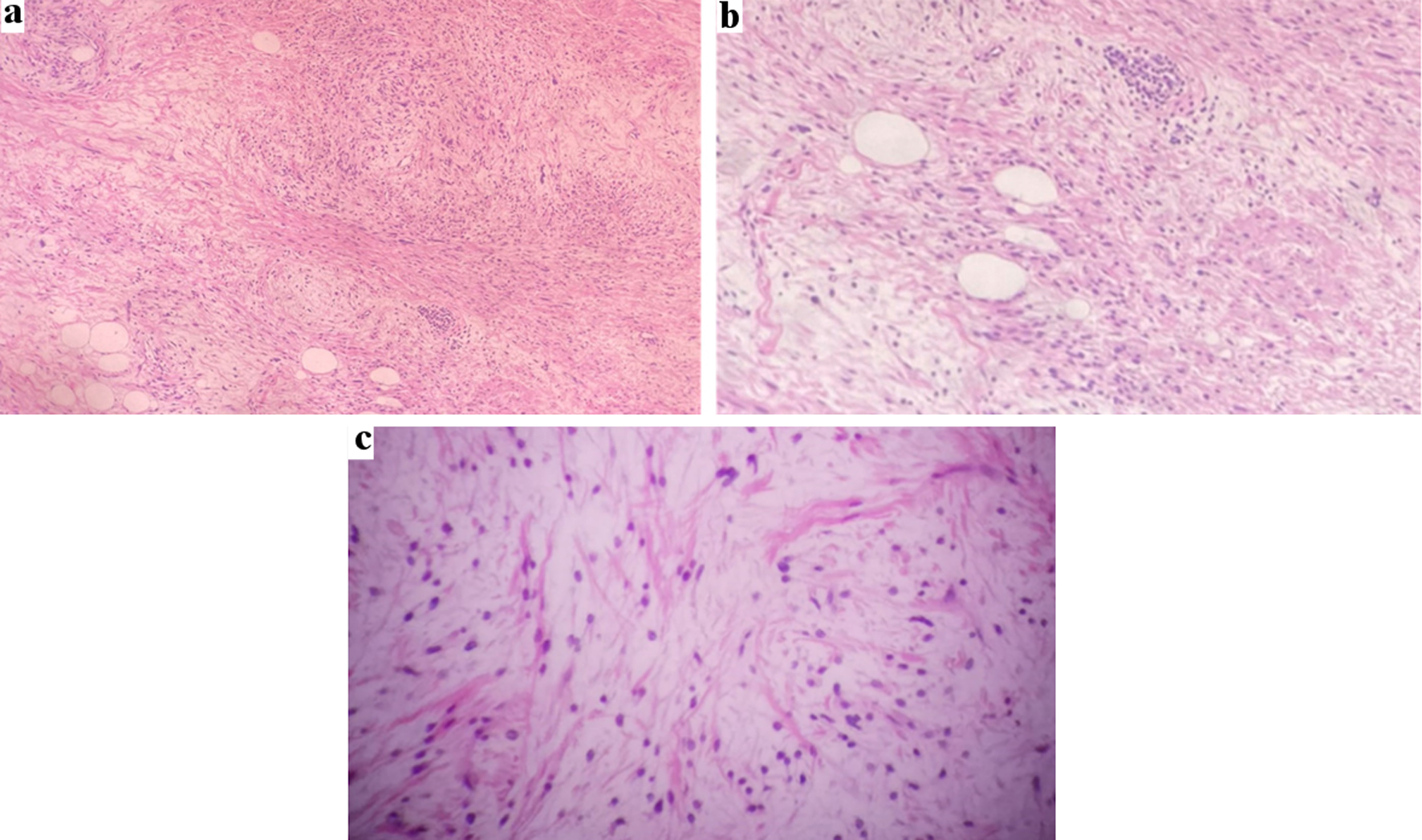 ![]() Click for large image | Figure 4. (a) Microscopic examination showing myofibroblastic spindle cell clusters and stellate cells interspersed with collagenous fibers, adipocytes, and myxoid areas. (b) Higher magnification scattered mild cellular pleomorphism with hyperchromatic nuclei. (c) Higher magnification, bipolar spindle cells arranged in intersecting fascicles in focal myxoid area. |